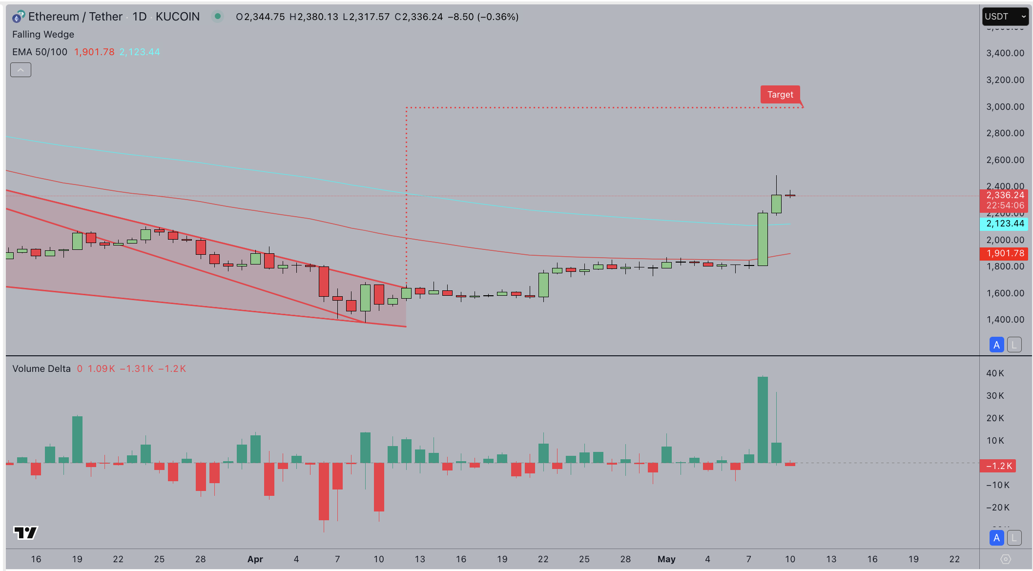 After closing two consecutive sessions above both the 50-day EMA at $1,901 and the 100-day EMA at $2,123, Ethereum price has now breached the wedge’s upper resistance with a convincing high-volume rally.