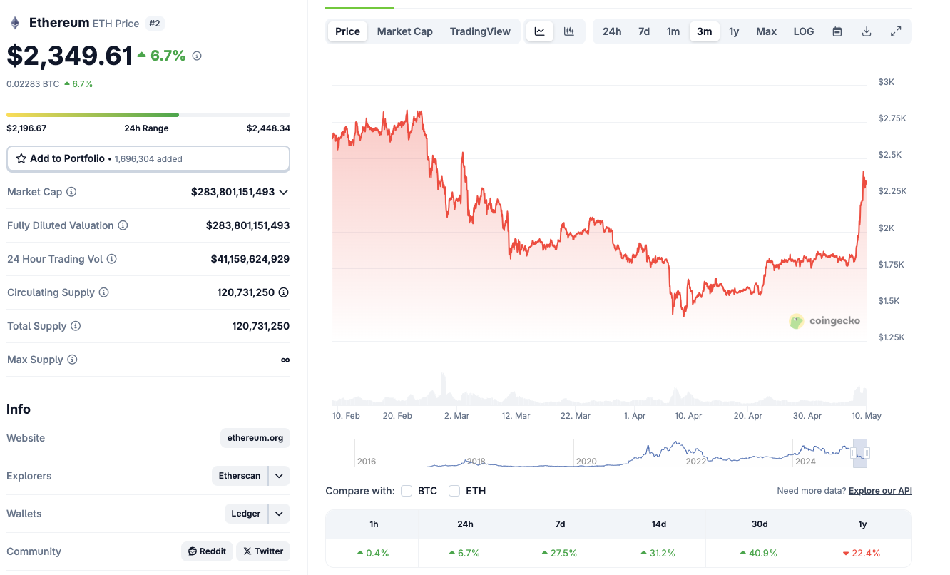 Ethereum (ETH) Moves Above $2,400 for the First Time Since January