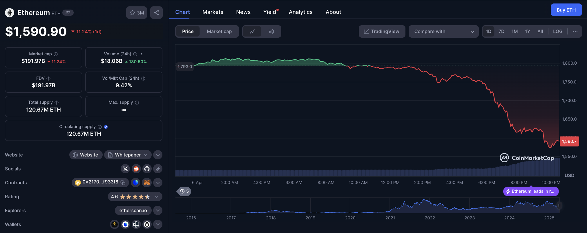 On Sunday April 6, ETH price dropped to a 3-week low near $1,650 on Sunday, April 6, tracking Bitcoin’s rapid decline below the psychologically critical $80,000 mark.