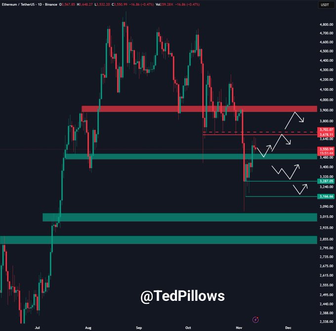 The Ethereum price has struggled to stay above $3,700 after facing renewed selling pressure. Despite the ongoing correction, the ETH price continues to attract growing interest from whales and institutions. Buying activity has intensified around key support zones, showing confidence among long-term holders. Analyst Ted highlighted that Ethereum’s ability to reclaim $3,700 will likely determine whether it can approach higher resistance levels. However, to retest $4,000 before year-end, bulls must first defend lower supports and establish stronger footing.