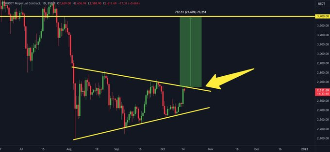Martinez stated, “Every bounce off this channel’s lower boundary has historically led to an average 130% price increase for Ethereum. If this pattern holds, a similar move could push $ETH to $6,000—provided the key $2,300 support level stays intact.”