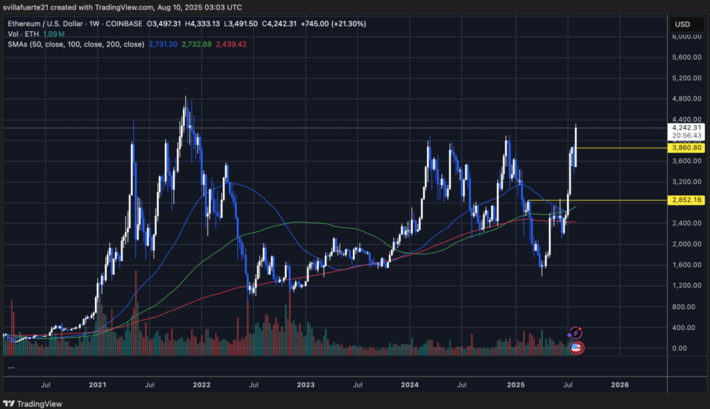 Ethereum (ETH) è salito a 4.307 dollari, raggiungendo il livello più alto da novembre 2021 e confermando un importante breakout sul grafico settimanale. Il rally, alimentato da un forte slancio rialzista, ha visto ETH guadagnare oltre il 21% nell’ultima settimana, superando con decisione la resistenza a 3.860 dollari che aveva limitato i rialzi all’inizio dell’anno.
