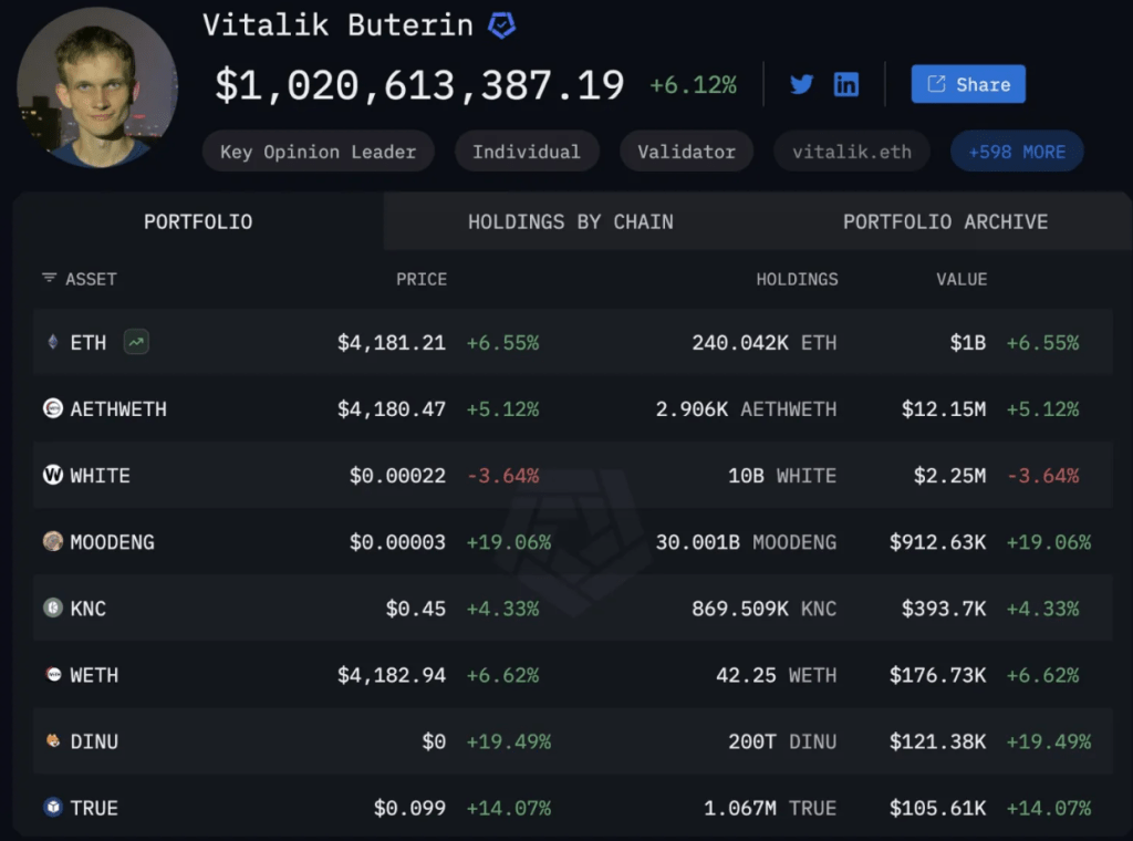 Secondo la piattaforma di analisi blockchain Arkham Intelligence, Vitalik Buterin detiene circa 240.000 ETH, insieme ad altri asset digitali come MOODENG e DINU. Ai prezzi di mercato attuali, le sue sole partecipazioni in ETH valgono circa 1 miliardo di dollari, consolidando il suo status di una delle figure più ricche nel mondo delle criptovalute — almeno on-chain.