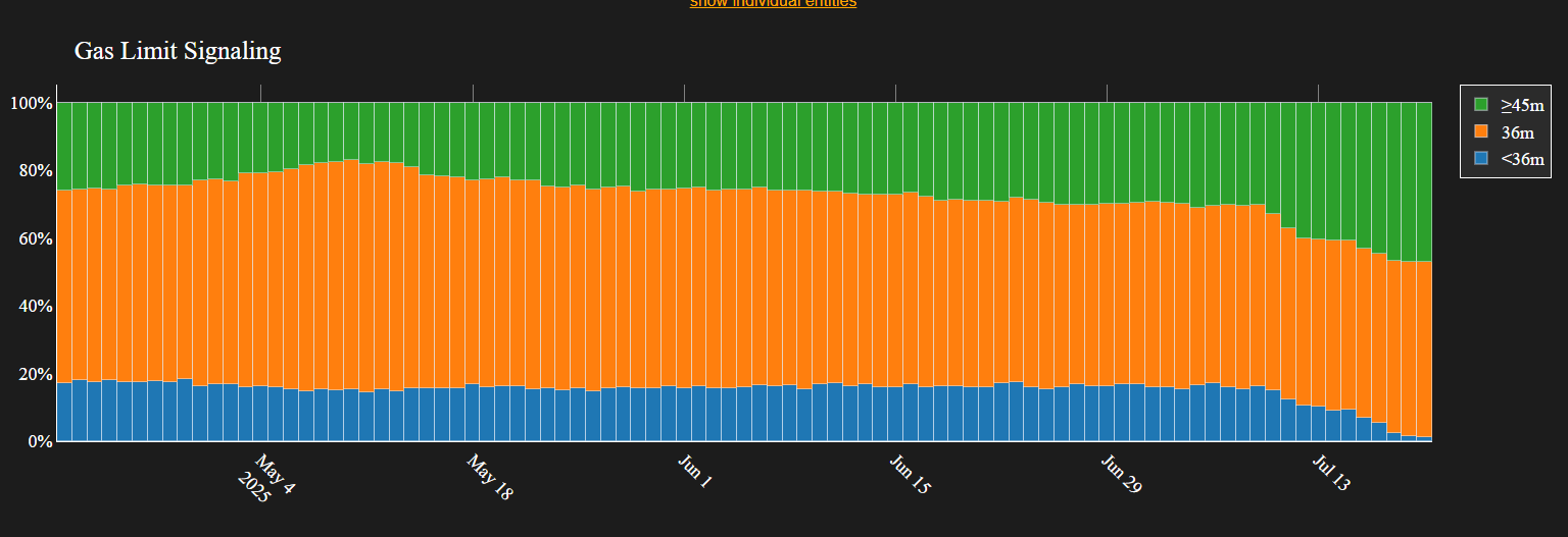 The weekend gas limit increase came as nearly half of all staked Ether (ETH) is now signaling support to raise the gas limit to 45 million or higher through a grassroots “pump the gas” campaign.