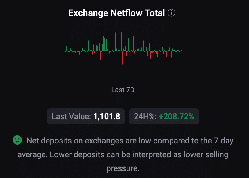 Our analysis of CryptoQuant’s data revealed that ETH’s net deposit on exchanges was low compared to the last seven days’ average, signifying less selling pressure.