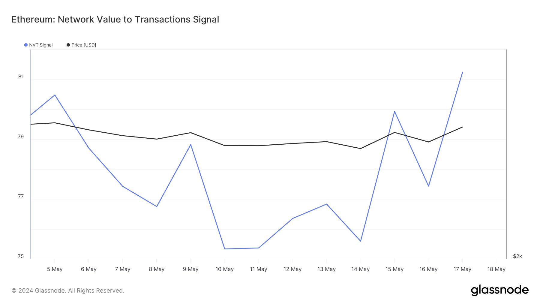 AMBCrypto’s look at Glassnode’s data revealed that ETH’s Network To Value (NVT) ratio registered a sharp uptick. A rise in the metric suggests that an asset is overvalued, hinting at a price decline.