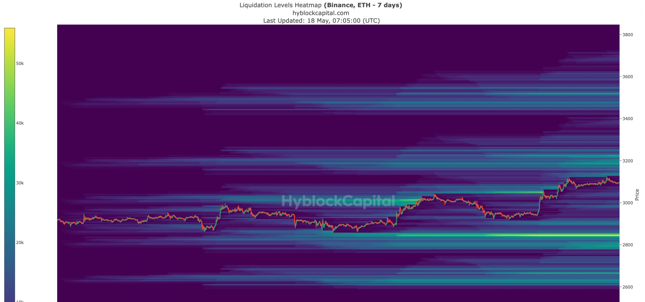 To see what targets it might reach if its bull rally sustains, AMBCrypto analyzed Hyblock Capital’s data. We found that ETH’s liquidation would rise near the $3.2k zone.