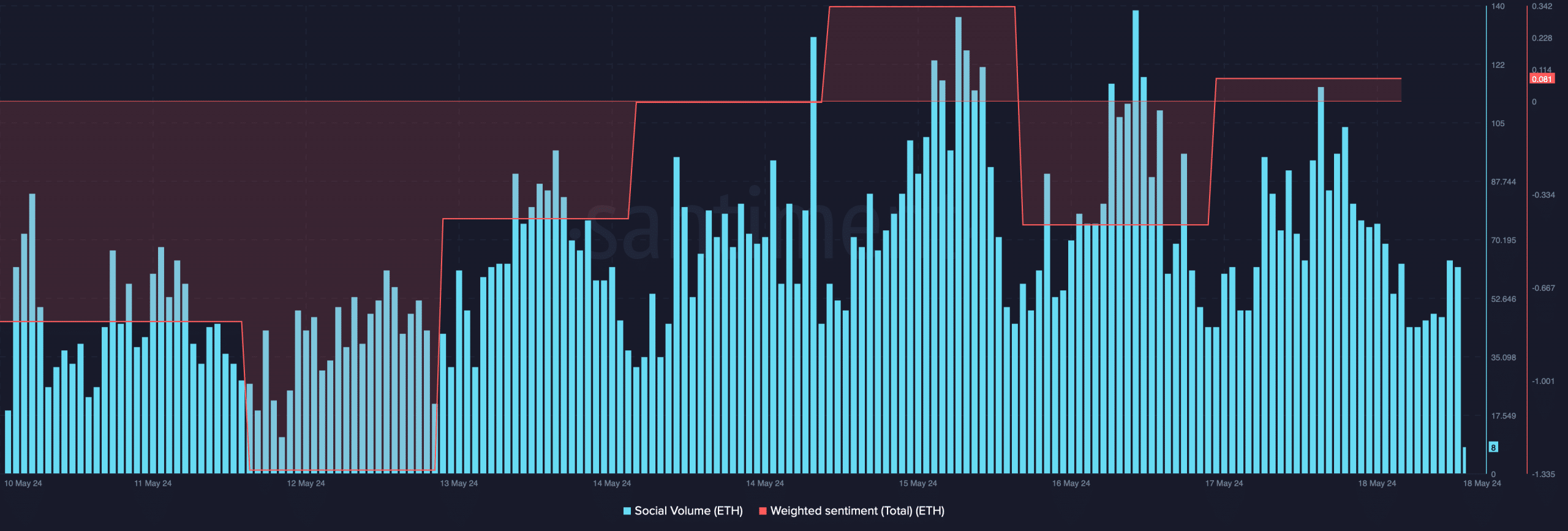 Its Weighted Sentiment also entered the positive zone, meaning the bullish sentiment around ETH became dominant in the market.
