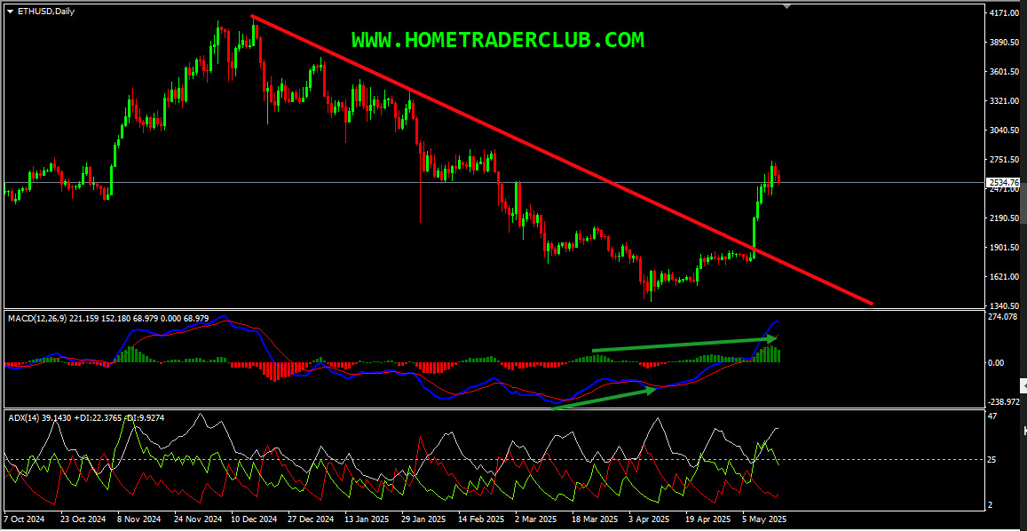 Ethereum D1(Daily) Chart Analysis – Bullish Convergence, Downtrend Line Breakout, ADX Indicator