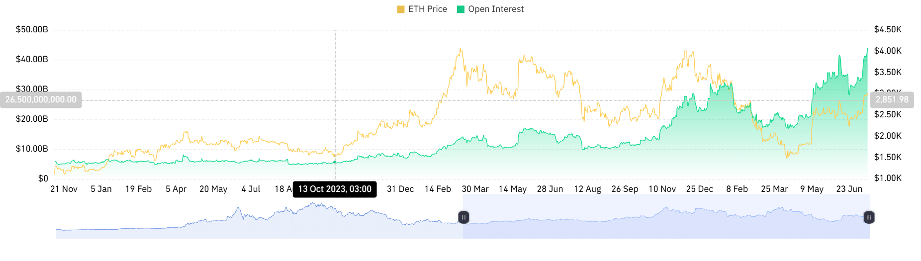 ETH’s overall Open Interest climbed to $43.59 billion.