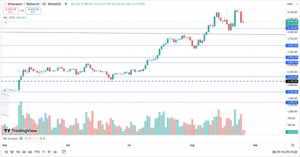 Ether has surged more than 240% since April, setting a new record above $5,000 on Sunday. This explosive rally has pushed investor profitability to levels reminiscent of previous bull markets, signaling that ETH may now be entering the “belief phase” — a stage often associated with sustained upward momentum. However, Monday brought a pullback as short-term traders booked profits. The ETH/USDT pair now risks a dip toward the 20-day EMA ($4,349), a critical support level that could determine whether the current uptrend remains intact or loses steam.