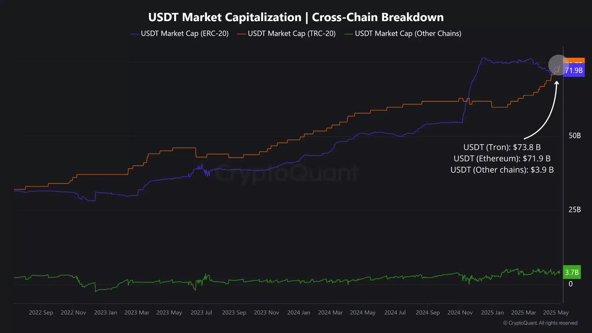 - Tron’s $73.8B USDT supply overtook Ethereum’s supply, with the total USDT supply at just above $150B.