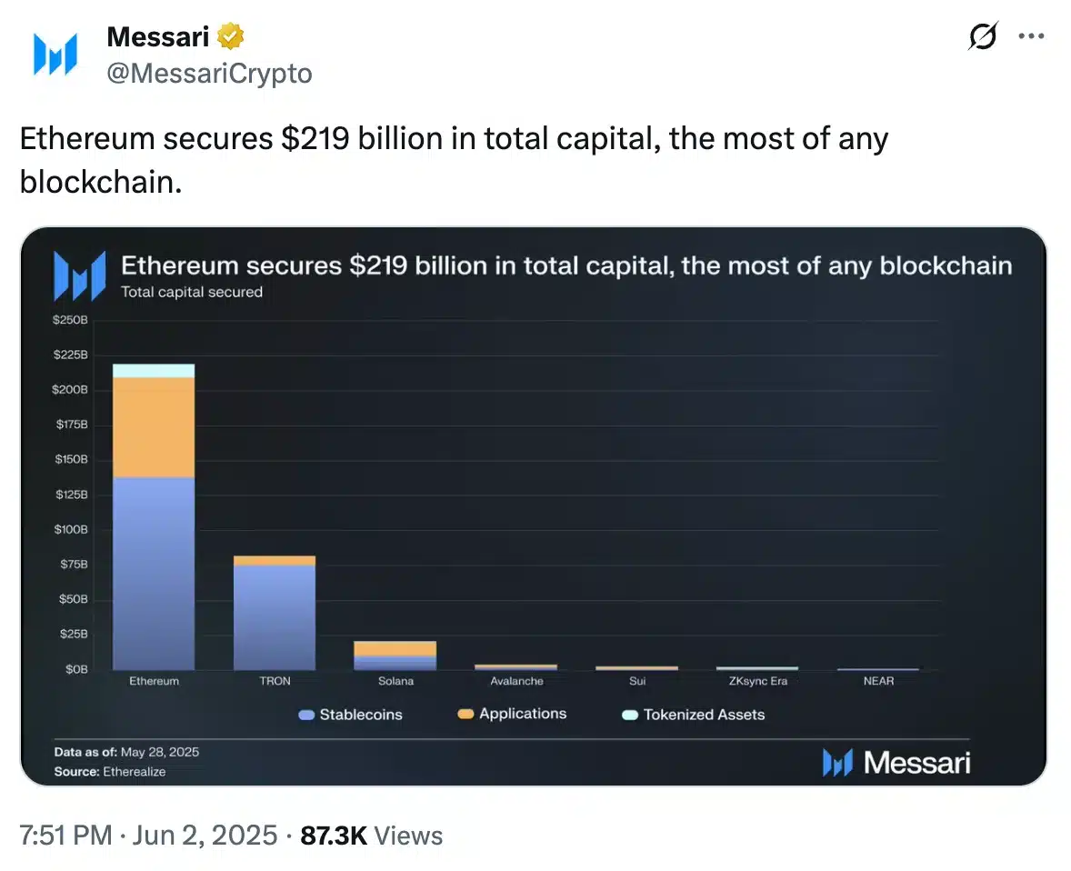 Of the $219 billion secured on-chain, a significant portion stems from stablecoins, highlighting their foundational role in ETH’s ecosystem, according to data visualized by Messari.