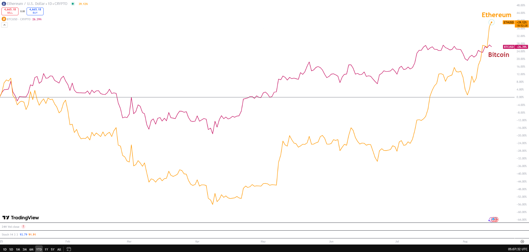 The world’s two largest cryptocurrencies have historically shown a positive correlation. However, Ethereum did not benefit from the Trump-driven rally that lifted Bitcoin earlier this year, until late July, when the US president signed the GENIUS Act, the first regulatory framework for stablecoins, into law. The move became a catalyst for Ethereum’s surge, sending the top altcoin’s price up 58% over the past month, while Bitcoin gained only 1.6%. USDC issuer Circle’s IPO was also a bullish factor for Ethereum, as the stablecoin operates on the Ethereum network, which has significantly boosted institutional adoption of Ether tokens.