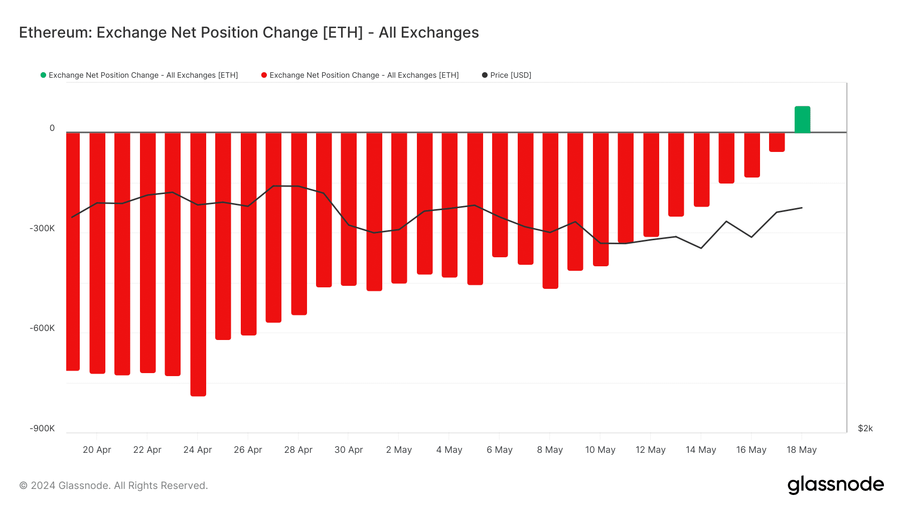 One thing we noticed was that the metric suddenly became positive on the 18th of May. As of this writing, the ETH net position change was 81,715.