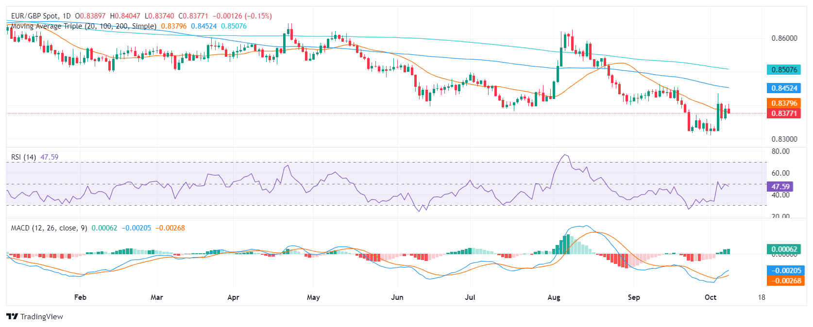 The EUR/GBP pair remains confined within a recent range and declined by 0.10% on Tuesday to 0.8380. However, the larger time frame bias remains bullish, as suggested by the technical indicators and the pair continues to side-ways trade after last week’s rally.