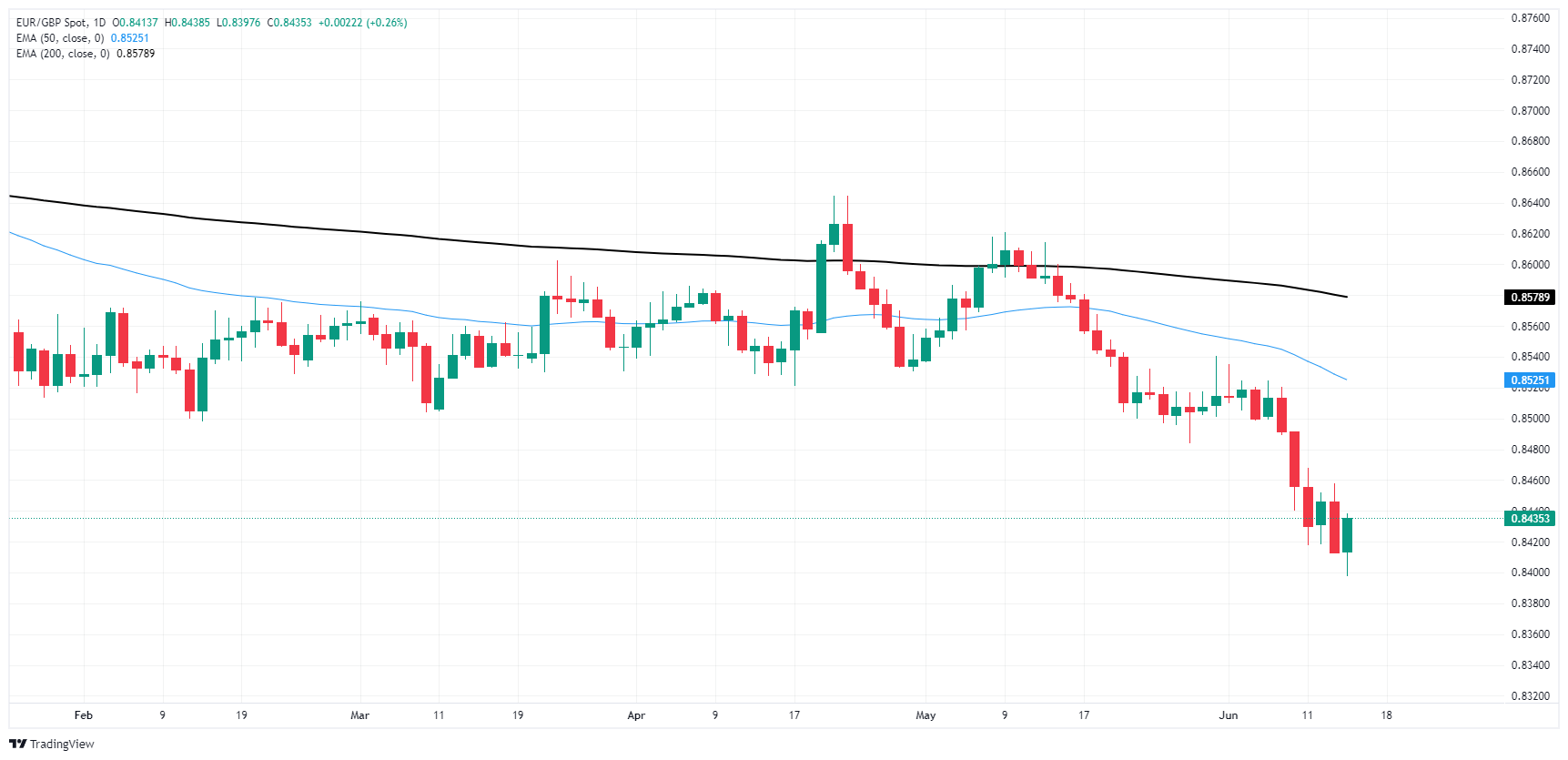 EUR/GBP dipped to a fresh 22-month low on Friday, tapping 0.8400 before finding a thin recovery that still leaves the pair battling at the bottom of an accelerating three-month decline from April’s peaks above 0.8600. European political turmoil continues to weigh on the Euro as France heads into a two-round snap election on June 30 and July 7, and Sterling traders are buckling down for the wait to next week’s rate call from the Bank of England (BoE).