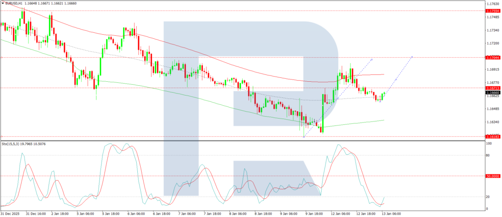 On the H1 chart, the market has completed a decline to 1.1655 and is now forming an upward corrective impulse towards 1.1700. Upon reaching this level, we expect a renewed wave of selling pressure to emerge. The Stochastic oscillator aligns with this view, as its signal line is currently below 20 but is turning upward towards 80, indicating room for a short-term rebound before the next potential decline.