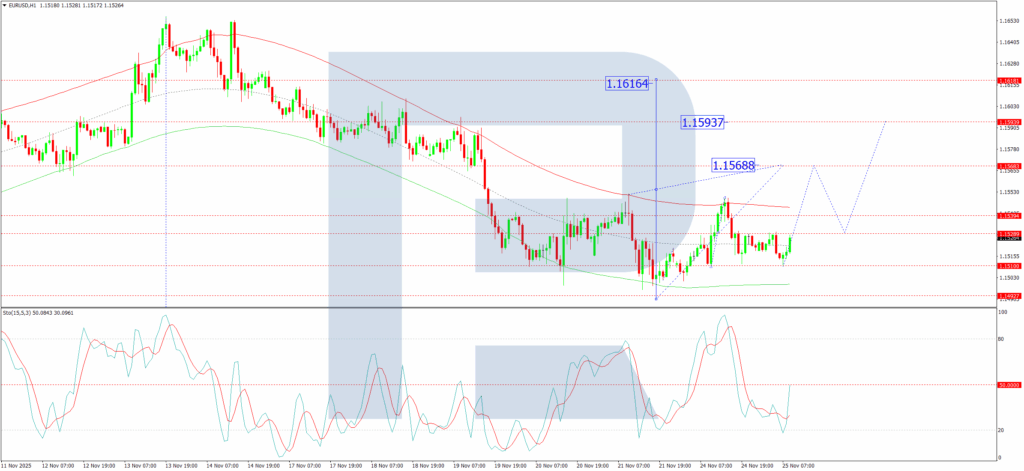 On the H1 chart, the pair completed a growth wave to 1.1549 before declining to 1.1510, forming a consolidation range around 1.1530. An upward breakout could initiate another leg higher towards 1.1568, potentially extending to 1.1616. It is crucial to view any such strength as a corrective rally before the larger downtrend resumes, targeting a move back towards 1.1500. Conversely, a downward breakout would directly activate the bearish potential for a decline to 1.1488, a level that could mark the completion of the first phase of the third wave within the broader downward trend. The Stochastic oscillator aligns with the near-term corrective view, as its signal line has turned up from the 20 level, suggesting room for a bounce towards 80.