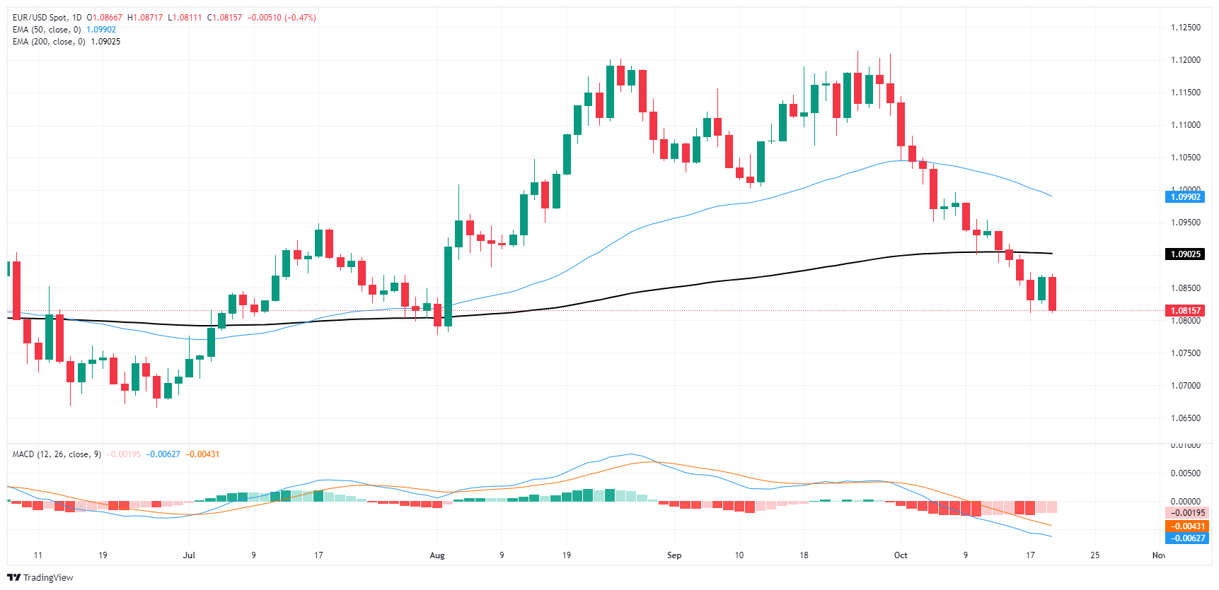 EUR/USD fumbled on Monday, kicking off a new trading week with a downside push as price action waffled back into familiar 12-week lows just above the 1.0800 handle. Markets remain apprehensive on the future pace of rate cuts, specifically from the Federal Reserve (Fed), and Purchasing Managers Index (PMI) activity figures due later in the week will give investors a glimpse at the shape of the global economy in the coming weeks.
