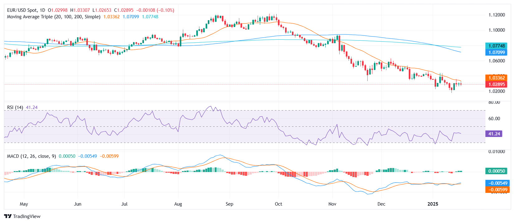 The EUR/USD pair struggled to maintain upward momentum on Friday, slipping by 0.20% to settle around the 1.0285 mark. Efforts to break decisively above the 20-day Simple Moving Average (SMA) once again fell short, underscoring persistent headwinds facing any near-term recovery. While the pair has managed to avoid a more pronounced sell-off, the market’s appetite for stronger gains appears muted. On the technical front, the Relative Strength Index (RSI) has nudged mildly higher to 44, a level that still suggests lingering bearish undertones. Meanwhile, the Moving Average Convergence Divergence (MACD) histogram continues to print flat green bars, indicating that buyers have yet to fully step in to reverse the pair’s recent rejection from overhead resistance.