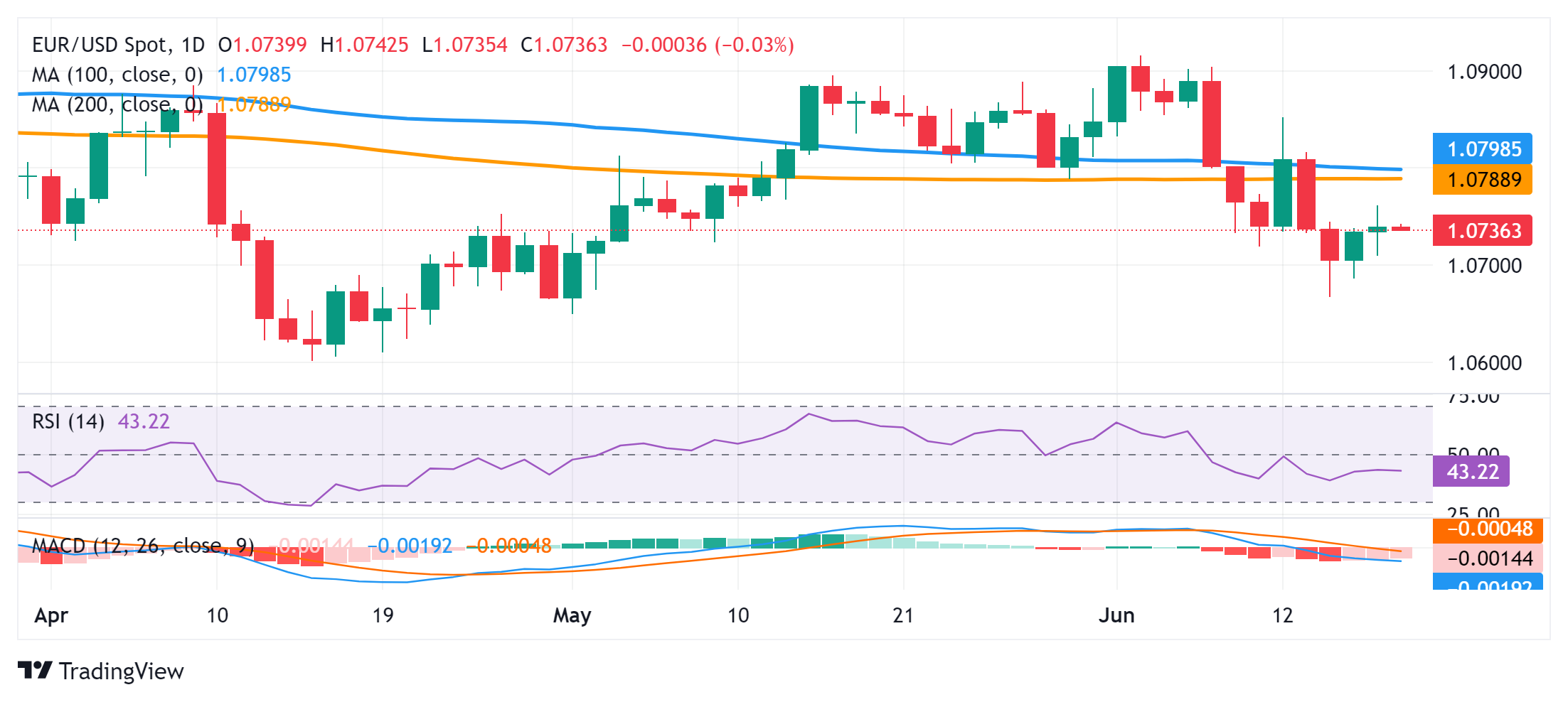 The EUR/USD pair ticks lower during the Asian session on Wednesday and moves further away from the weekly high touched the previous day. Spot prices remain on the defensive below mid-1.0700s, though the downside seems cushioned in the wake of subdued US Dollar (USD) price action.