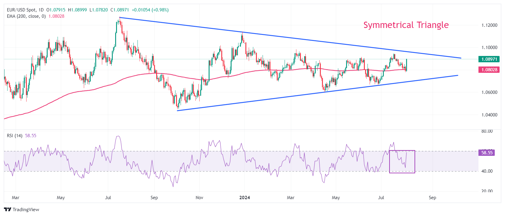 EUR/USD recovers sharply after discovering strong buying interest near the 200-day Exponential Moving Average (EMA), which trades around 1.0835. This has improved the near-term outlook of the shared currency pair. The major still trades inside a Symmetrical Triangle formation on a daily timeframe, exhibiting a sideways trend. The aforementioned chart pattern signifies a sharp volatility contraction, which is expected to remain for a while amid the absence of clear signals of a breakout or a breakdown.