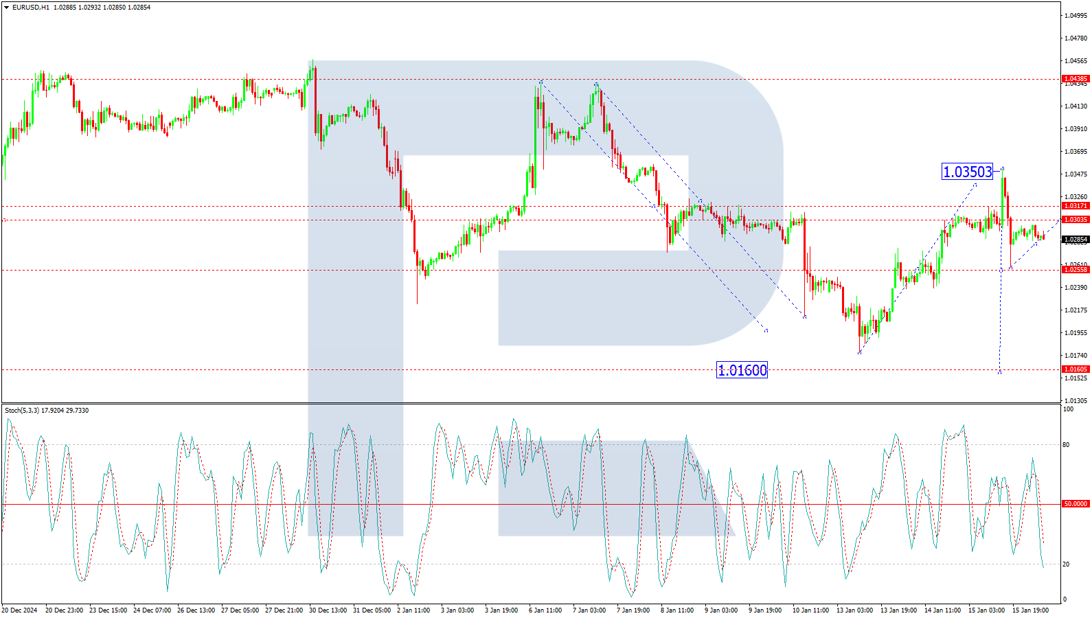 On the H1 chart, the pair formed a downward impulse to 1.0258, with a correction expected to target 1.0300. Once this level is reached, the downward wave may resume, aiming for 1.0210 and potentially extending to 1.0160. The Stochastic oscillator supports this outlook, with its signal line below the 50 mark and heading towards 20, suggesting continued downward momentum.