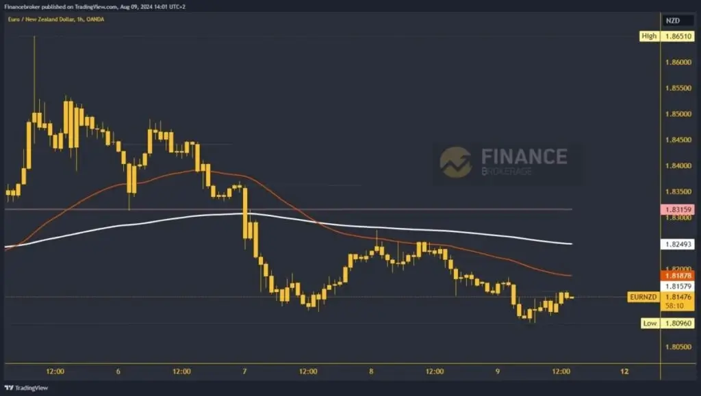A new weekly low was formed this morning at the 1.80960 level. After that, we saw the initiation of a bullish consolidation up to the 1.81580 level. There, we tested the daily open price, and for now, we are staying below it. We need a new impulse that would move the pair above to a safer zone. Then, EURNZD would stabilize there to start a further recovery.