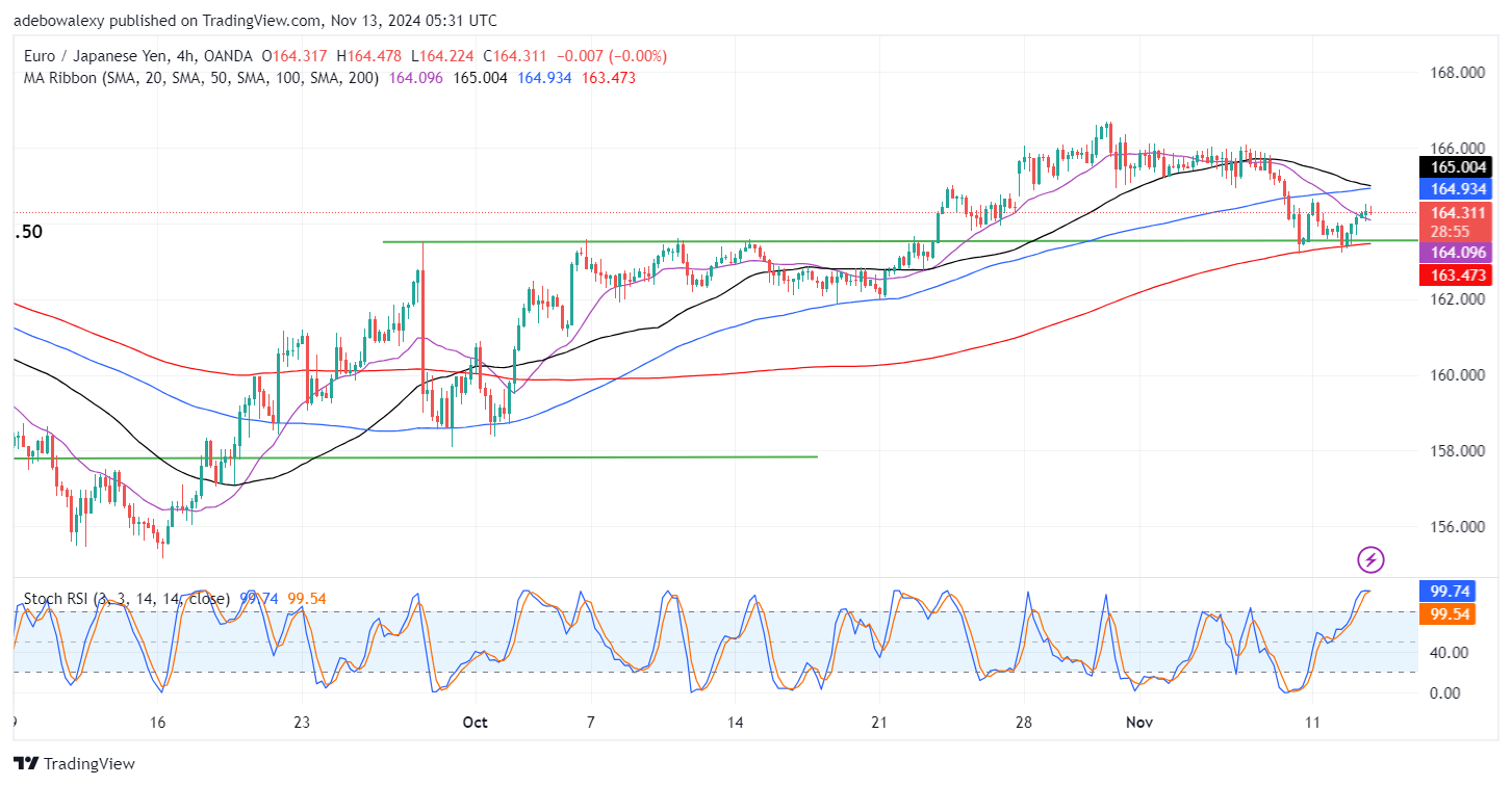 As noted above, price action in the EURJPY daily market had rebounded off the 163.50 support level. However, the momentum with which the market is progressing seems dampened. The last price candle on the chart can be seen appearing just above the 100-day Moving Average line.