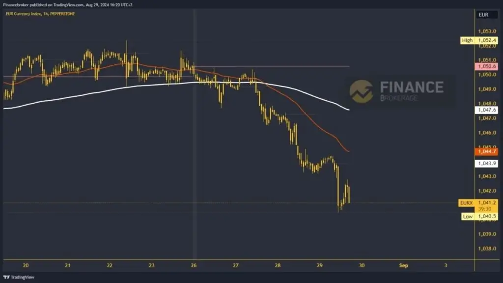 Today, the euro index sank to a new weekly low at 1040.5. Soon after, we saw the initiation of a bullish consolidation and the index’s recovery above 1042.0. We have been under strong bearish pressure since Tuesday, and this slight recovery today does not inspire the Euro index to start a more concrete recovery. Based on that, we expect to see a further pullback to a new monthly low.