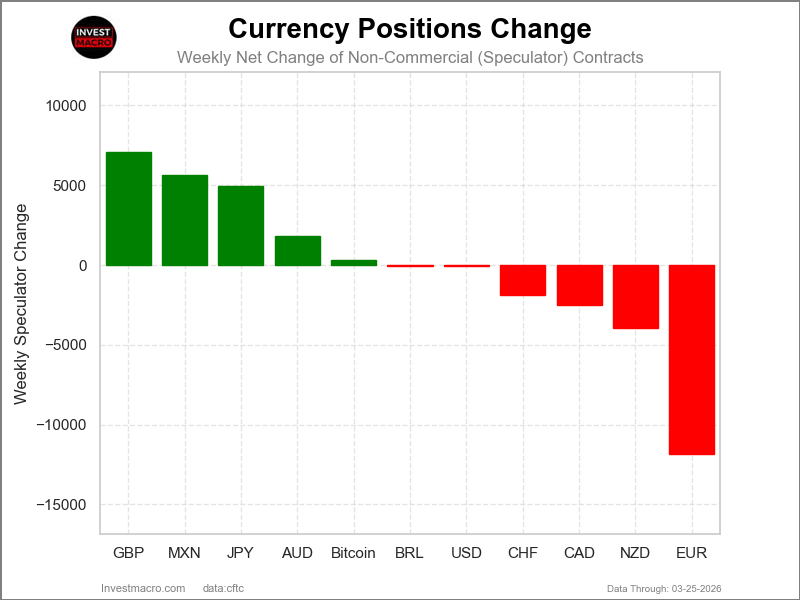 Highlighting the Currencies speculator positions this week was the continued drop in the Euro speculator bullish position. It has been quite a turnaround for the Euro speculator positions in recent weeks as speculators pushed the Euro net positions to an all-time top ten high bullish position on February 10th at a total of 180,305 net contracts. Since that recent high, Euro positions have fallen for six consecutive weeks and by -171,026 net contracts over that time period. This has brought the overall speculator position down from 180,305 bullish positions to this week’s net contract level of just 9,279 contracts. Overall, the Euro position has continuously been in a bullish standing since March 11th of 2025. The Euro price has now fallen below the 1.1600 exchange rate in the Currency markets and has now declined in six out of the last nine weeks and currently trades at the 1.1556 area. The Euro traded as high as 1.2110 late in January before the Iran war broke out and has now come back towards the 1.1500 major support level.