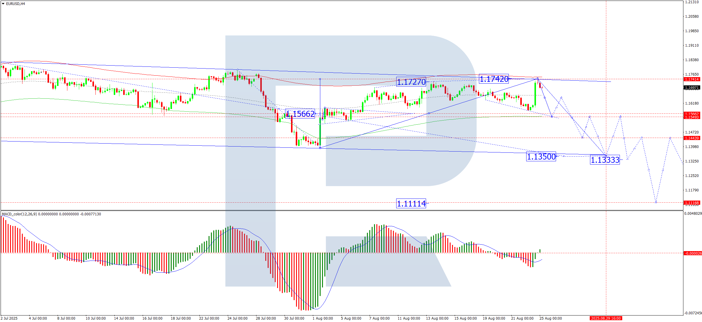 On the H4 chart, the market has formed a consolidation range around the 1.1566 level. Following an upward breakout, the corrective wave appears to have completed at the 1.1742 high. The primary focus is now on the potential initiation of a new bearish wave targeting the 1.1550 level. This scenario is technically supported by the MACD indicator, whose signal line remains below zero and is pointing decisively lower.