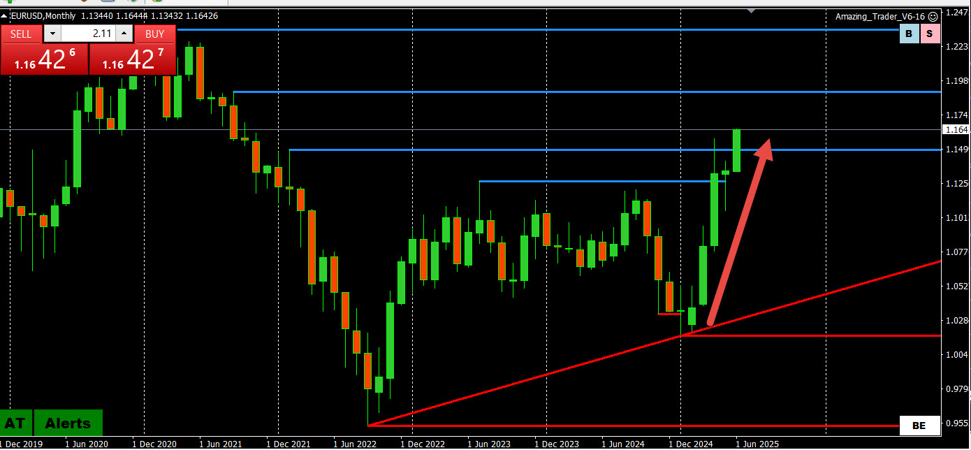 EURUSD is in a clear multi-timeframe uptrend with no significant signs of reversal as of June 2025. Any dip toward 1.1580-90 or even 1.1450 should be viewed as a buying opportunity, not a trend change unless key support levels are broken.