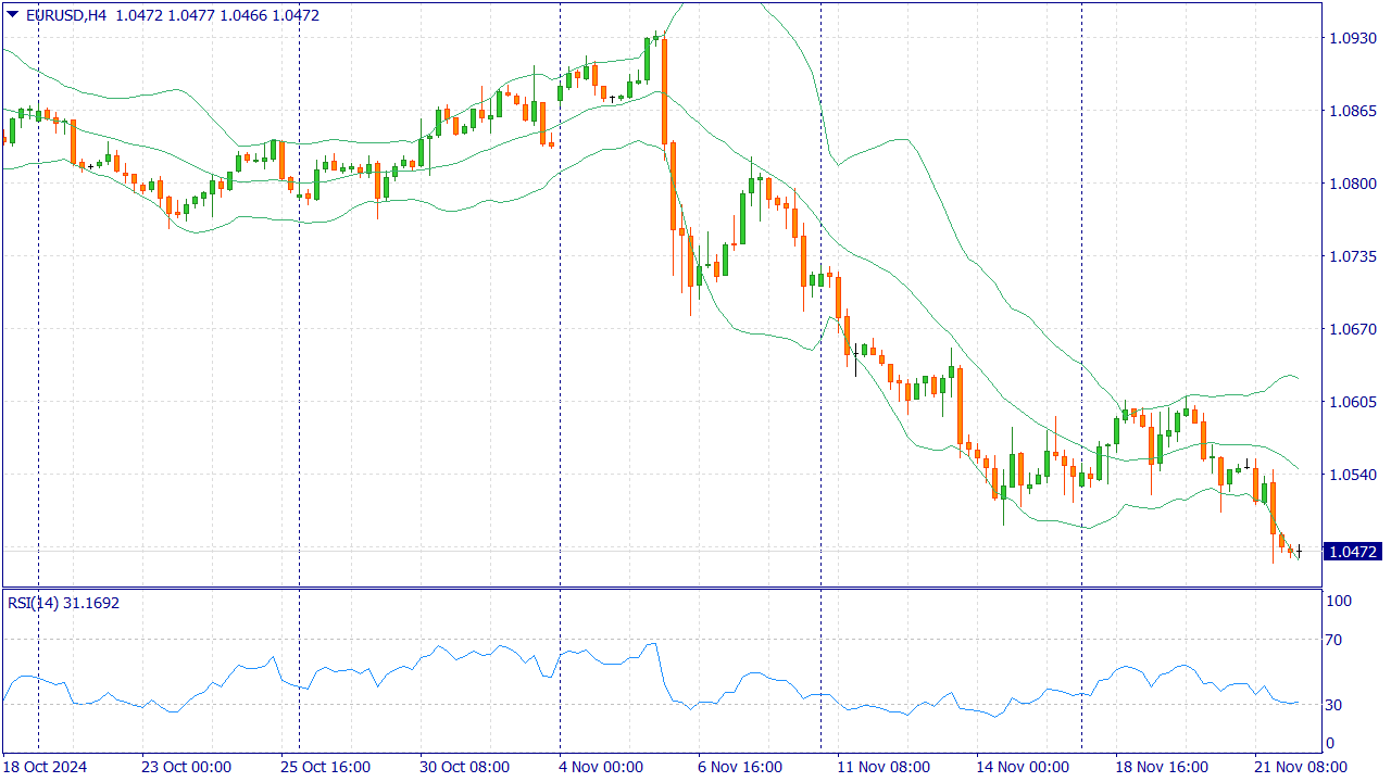 The downtrend has not been interrupted since late October, and the pair has reached new multi-month lows. The nearest support is at 1.0450, a psychological level that could attract buyers; a break below this area could open 1.0400 as the next target.