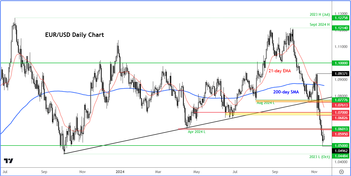 From a technical perspective, the EUR/USD continues its bearish trajectory, with lower highs and lower lows. The FX pair last week tested and briefly broke below the 1.0500 level before rebounding slightly. For now, short-term resistance around the 1.0590-1.0600 area has held firm.