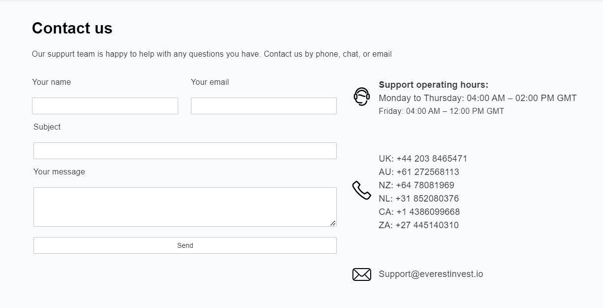In this category, EverestInvest does a good job of providing the support and assistance traders need around the clock. They are available 24/6 via phone, email, and an online form in your native language.