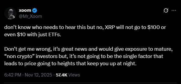 “ETFs alone” won’t magically multiply XRP’s market cap, Xoom argued. This aligns with other analysts’ views that ETFs validate an asset but don’t guarantee outsized gains.