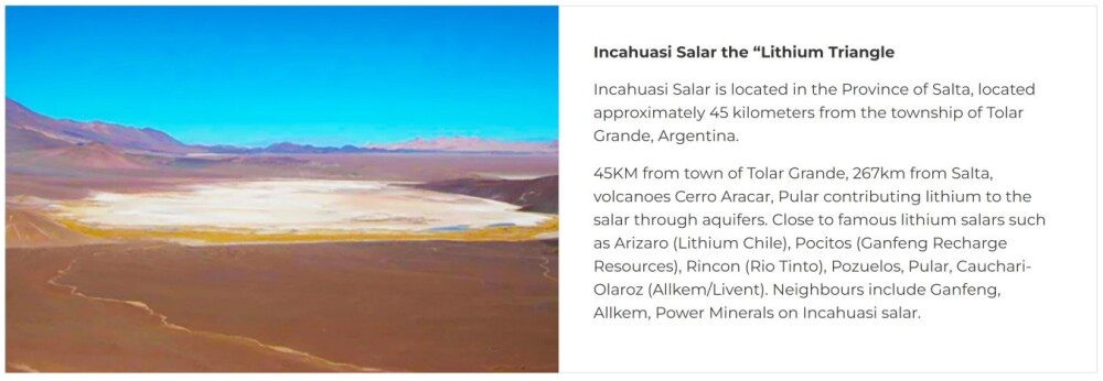 The Incahuasi Salar Project, which is easily accessible by road, is located in the province of Salta in northwestern Argentina, and it supports conditions for quality lithium mines at depth. The region has been substantially explored and it has been found that the lithium brines are close to the surface. The following picture from the company’s website gives some general information about the project.