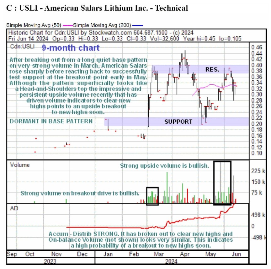 American Salars Lithium Inc. (USLI:CSE) is a lithium exploration company whose stock is viewed as a Strong Buy here for both fundamental and technical reasons.