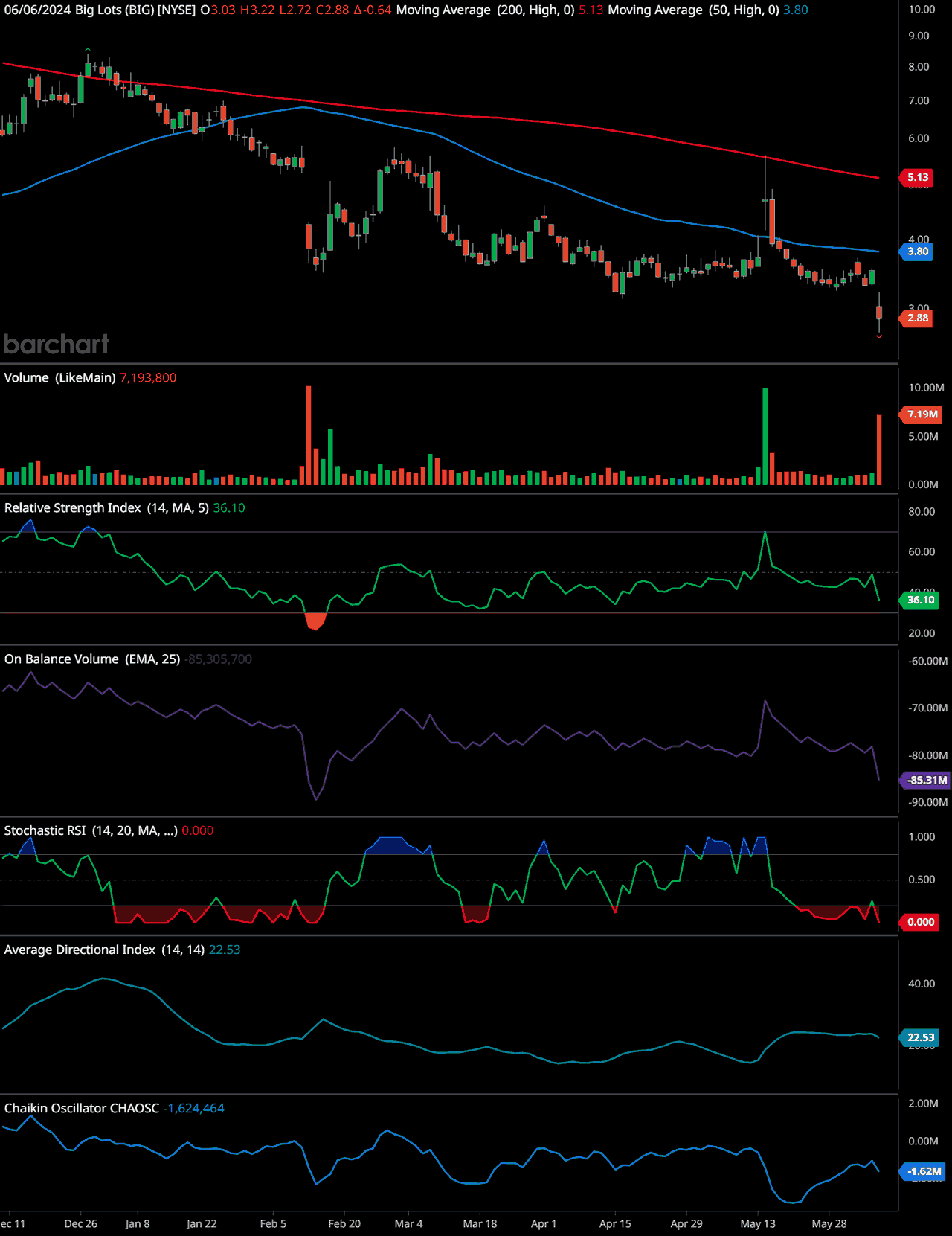 The chart of Big Lots (BIG) shows a clear downward trend. The stock has been consistently declining since December, with the price moving below both the 50-day and 200-day moving averages, which are currently at 3.80 and 5.13 respectively. The recent price is 2.88, indicating a significant bearish trend.