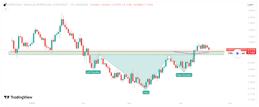 In an X post, Persis10t revealed that Fartcoin has completed a classic inverse Head and Shoulders pattern, signalling a potential bullish reversal. He added that the neckline around $0.7390 aligns with the 0.5 Fibonacci retracement level and 100 EMA, adding strong confluence.