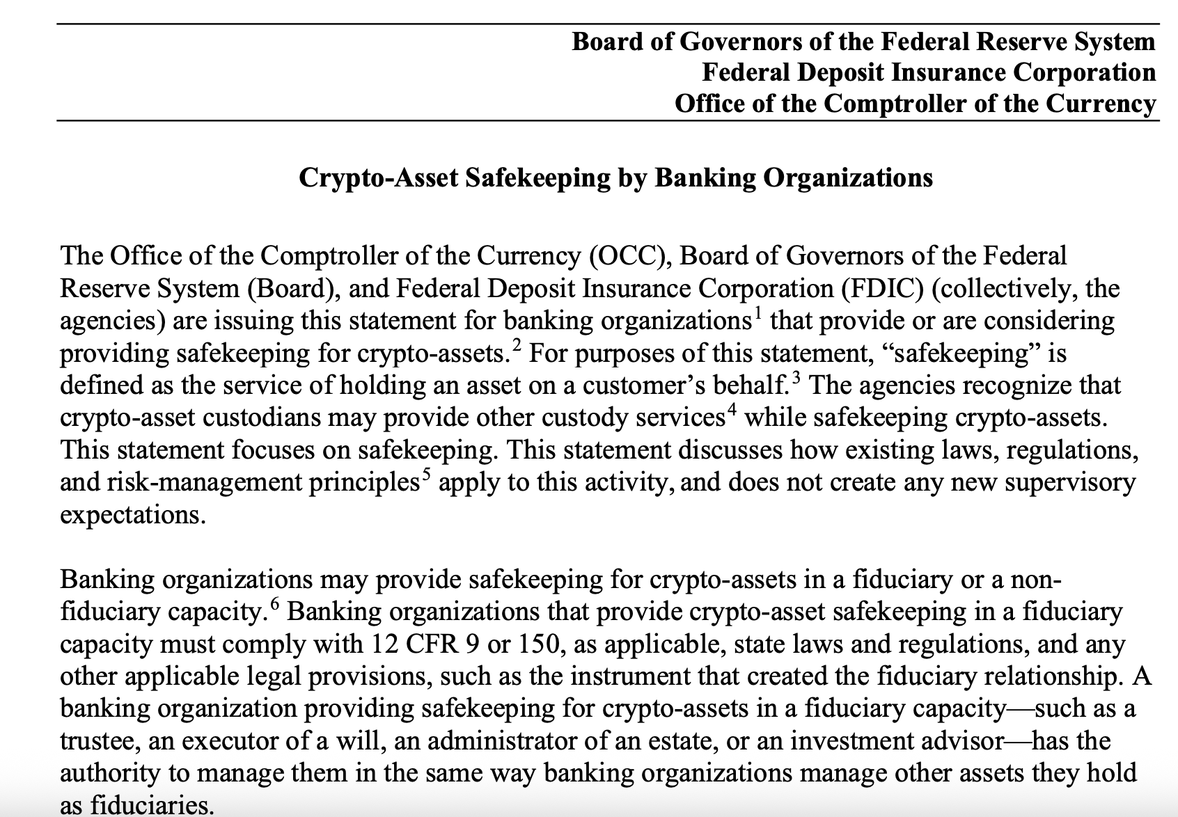 “Providing crypto-asset safekeeping services may entail significant resources and attention,” it reads. The three federal agencies responsible for the document are the Federal Deposit Insurance Corporation (FDIC), the Office of the Comptroller of the Currency (OCC) and the Board of Governors of the Federal Reserve System.
