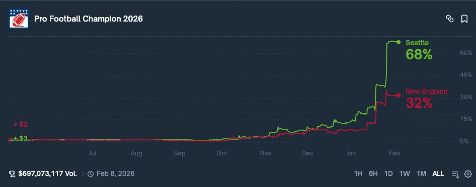 Seattle is favored on Polymarket by 68% as of the time of writing on February 3.