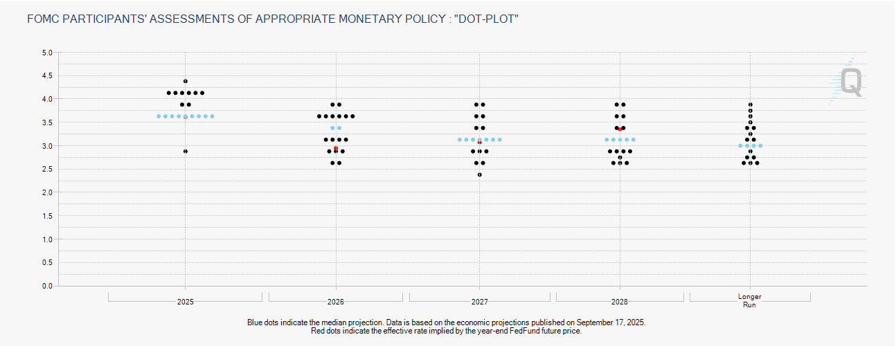 However, the biggest source of risk for the financial markets lies in the major disagreement over 2026. The Fed’s own long-term projections (known as the Dot Plot) suggest a cautious approach with only 50 basis points of total cuts planned for all of 2026.