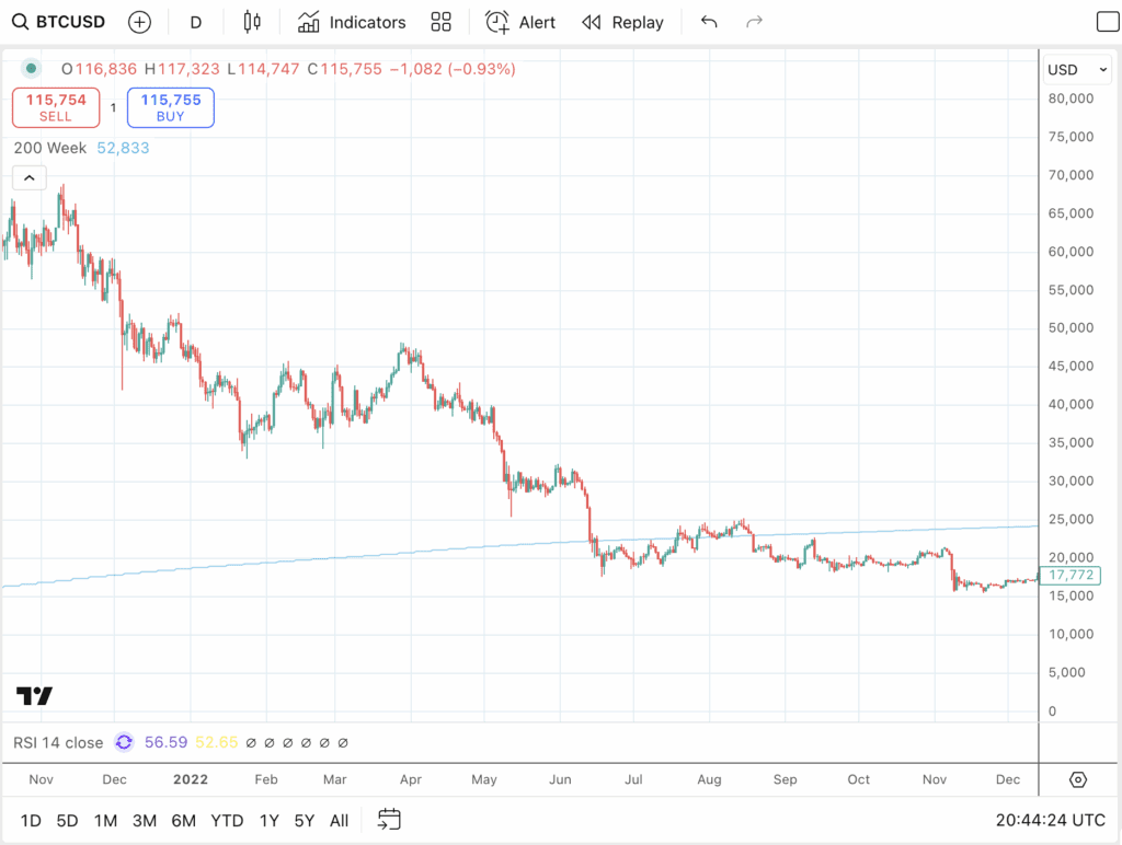 Currently, bitcoin’s 200-week SMA is sitting at about $52,000. If we see a parabolic rise in bitcoin’s price in the coming months, it could rise as high as $65,000, before bitcoin’s price drops to such a price point or lower some time in 2026.