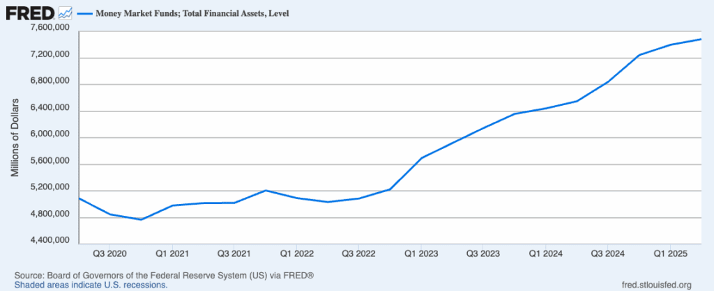 Powell also signaled today that two more rate cuts could be on the way before the year is out, which would only further reduce returns in money market funds, potentially pushing investors into hard assets like bitcoin and gold as well as riskier assets like tech and AI-related stocks.