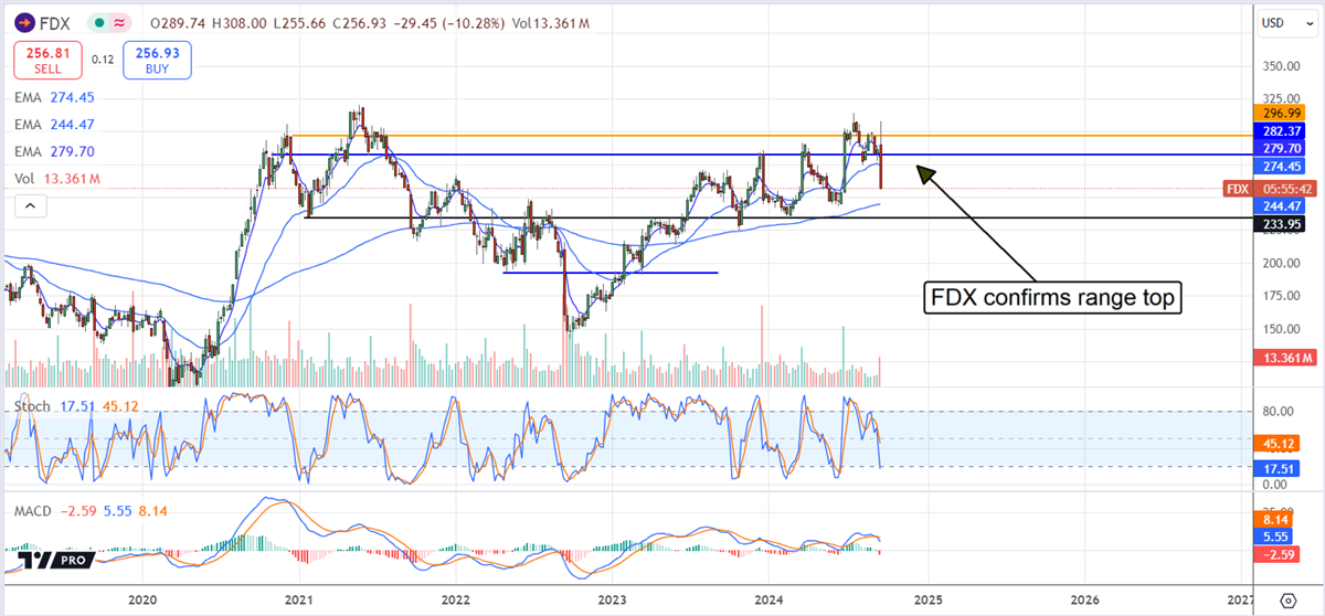 FedEx’s price action confirms resistance at the top of the trading range. The market fell 15% after the report, showing strong resistance to higher prices at that level, and is likely to continue lower over the coming weeks. The best target for firm support is near the $235 level, which may be reached soon. The risk is that market sentiment will continue to sour and FDX stock will fall out of its range and move to the $200 level or lower. The opportunity for investors is to put this stock on a watchlist and wait for it to bottom. That will come in alignment with a brightening economic outlook.