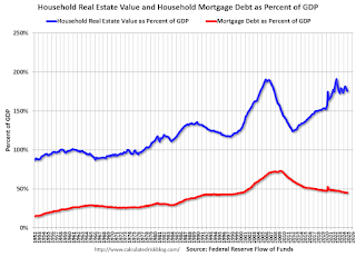 The value of real estate, as a percent of GDP, decreased in Q4 and is below the recent peak in Q2 2022, but is well above the median of the last 30 years.