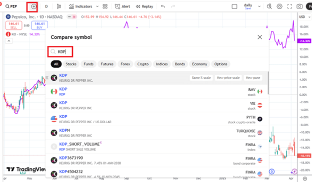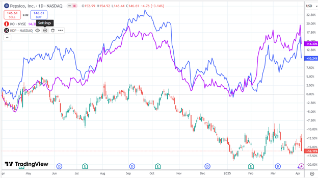 Below, we see that Pepsico (PEP) is underperforming both Coca-Cola (KO) and Dr. Pepper (KDP):